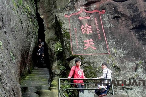 其實(shí),一線(xiàn)天是我國(guó)名山奇峰中常有的石景,因兩壁夾峙,縫隙所見(jiàn)藍(lán)天如同一線(xiàn)而得名。而的桃源洞一線(xiàn)天,絕壁出裂開(kāi)一縫,直透崖端,上寬下窄,高90米,全長(zhǎng)120米,共206個(gè)臺(tái)階。向上攀行時(shí),兩邊巨石好似向頭頂壓來(lái),唯見(jiàn)上方一線(xiàn)天光,那種感覺(jué)真是既奇妙又壯麗無(wú)比。明代旅行家徐霞客于崇禎三年(公元1630年)登臨此處奇觀(guān),并記敘如下:“上辟山巔,遠(yuǎn)透山北,中不能容肩,蓋之乃受,累級(jí)斜上,直貫其中。余所見(jiàn)‘一線(xiàn)天’數(shù)處,武夷、黃山、浮蓋,未曾見(jiàn)若此之大而逼、遠(yuǎn)而整者”。